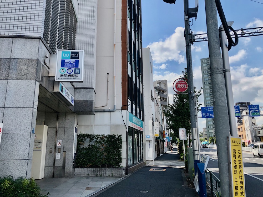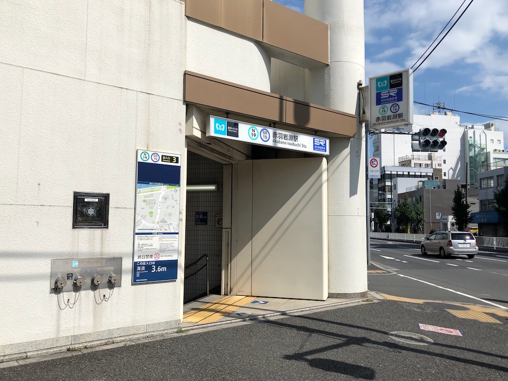 写真は横断歩道手前の左手すぐのところの赤羽岩淵駅1番出入口です。