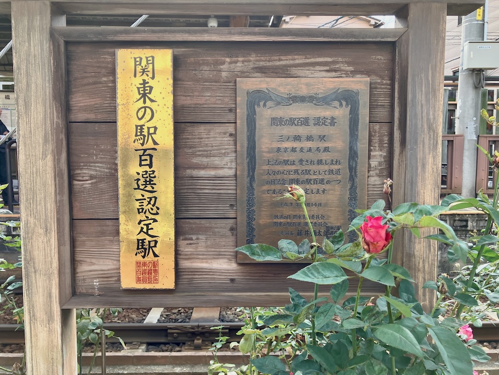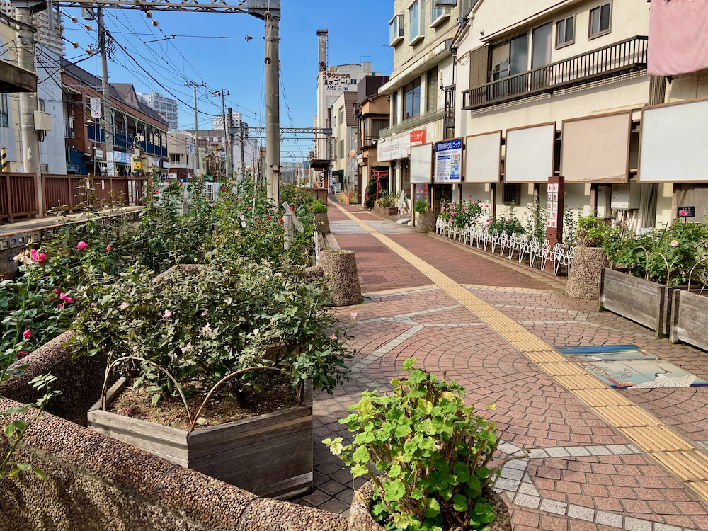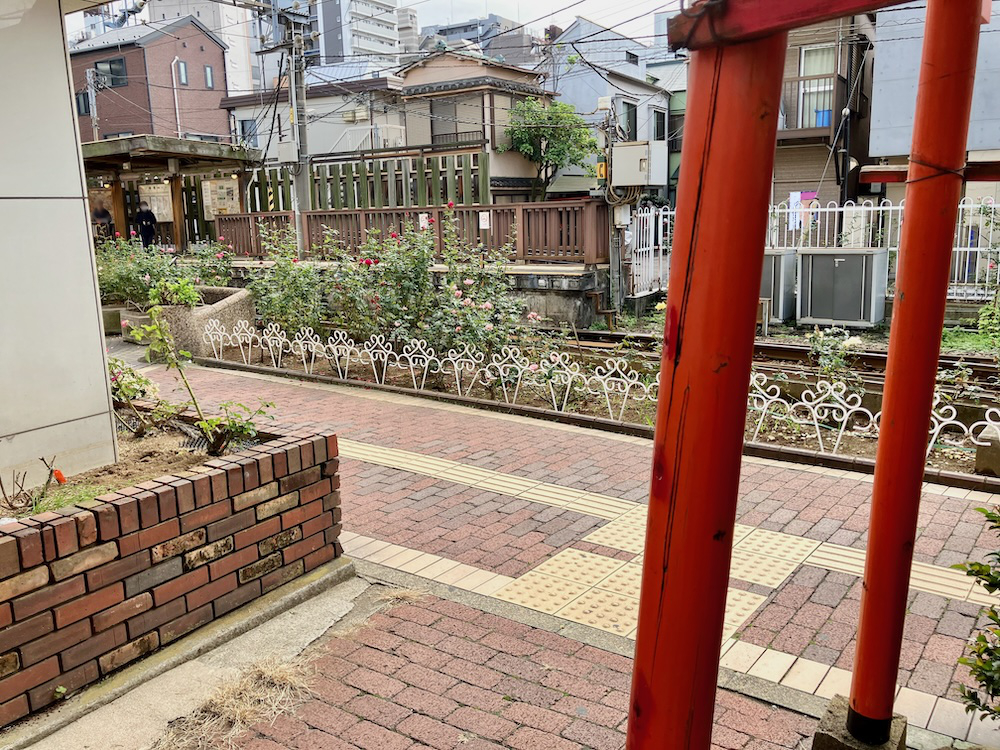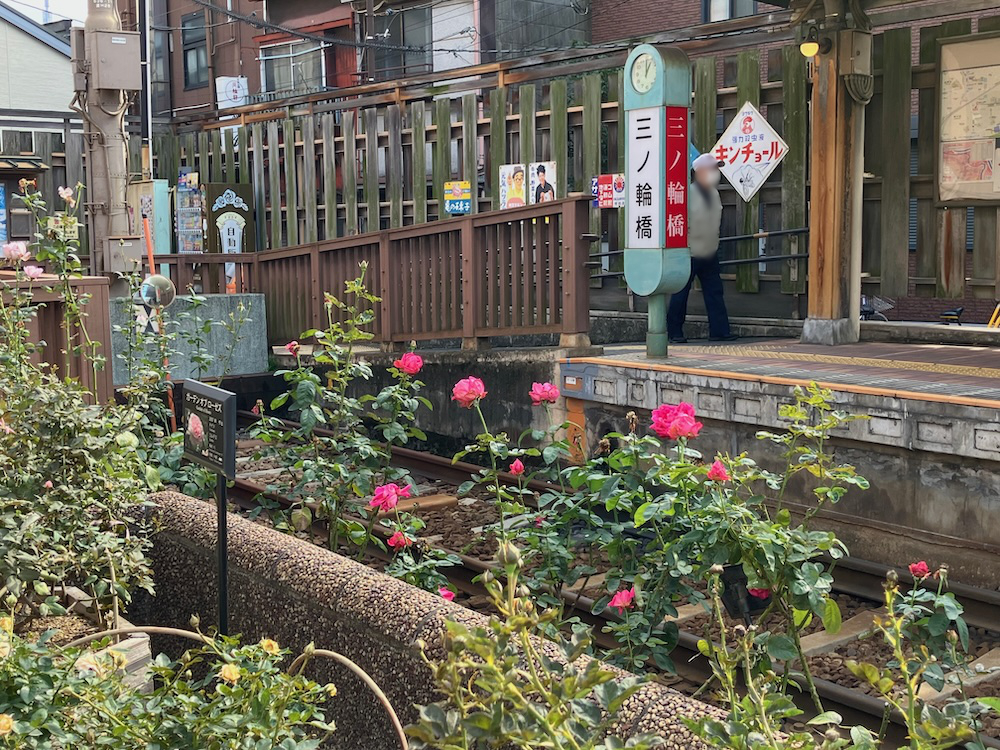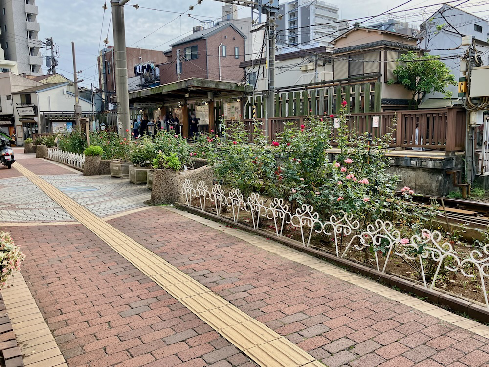 三ノ輪橋停留所とバラの花壇の広場。