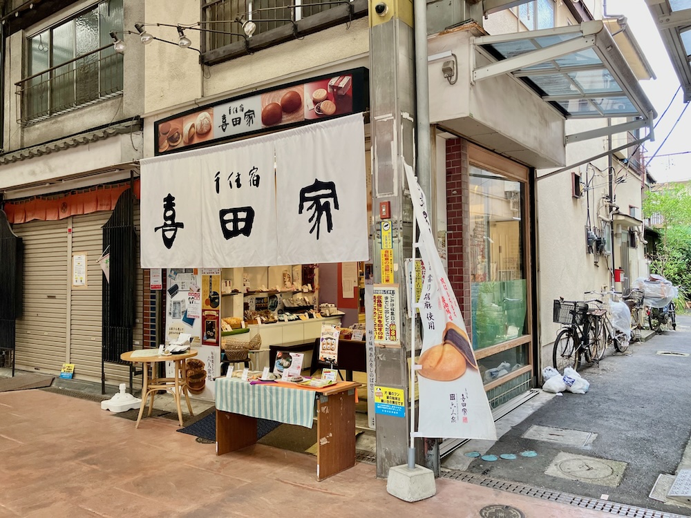祠と鳥居の有った路地を進んんで行くと、ほぼ正面に和菓子屋「千住宿 喜田家」。