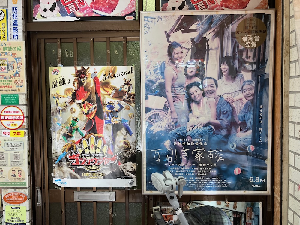「万引き家族」と「ゴジュウジャー」のポスターが貼られてますね。