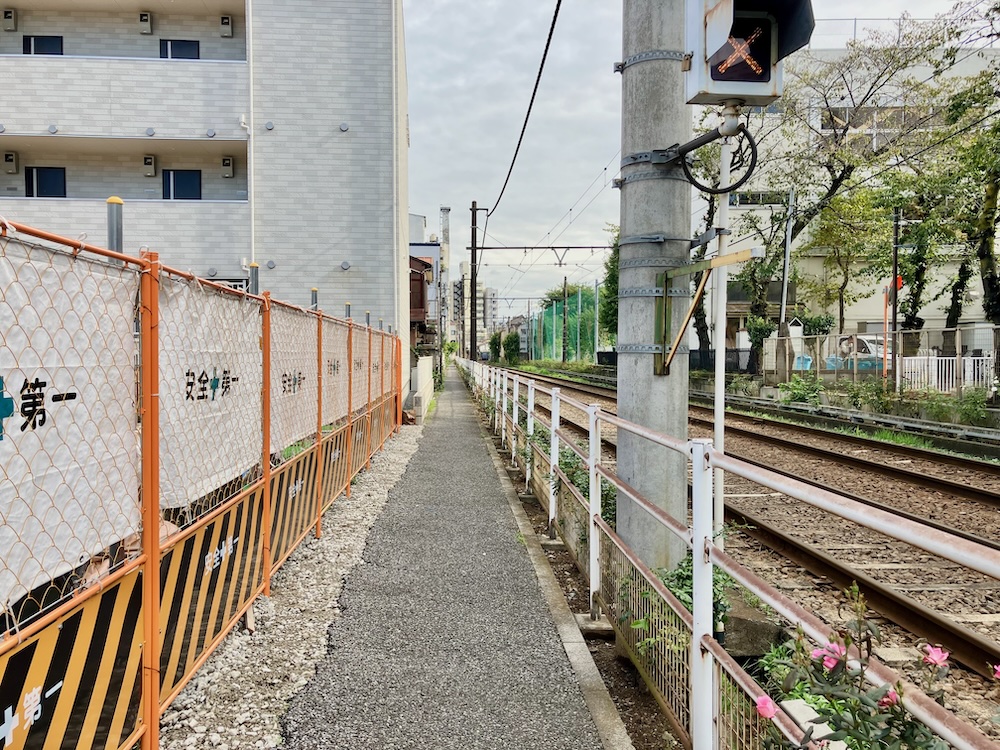 線路沿いのこの細い歩道を行くと、