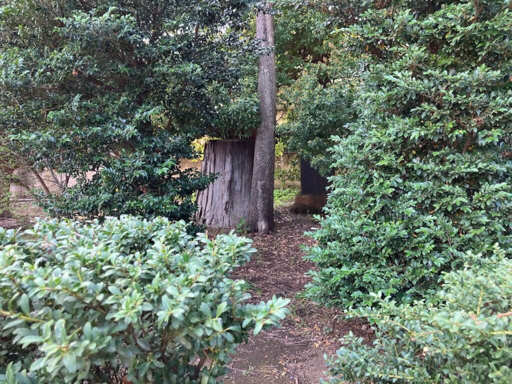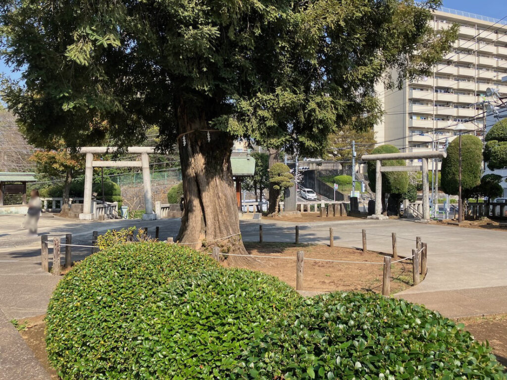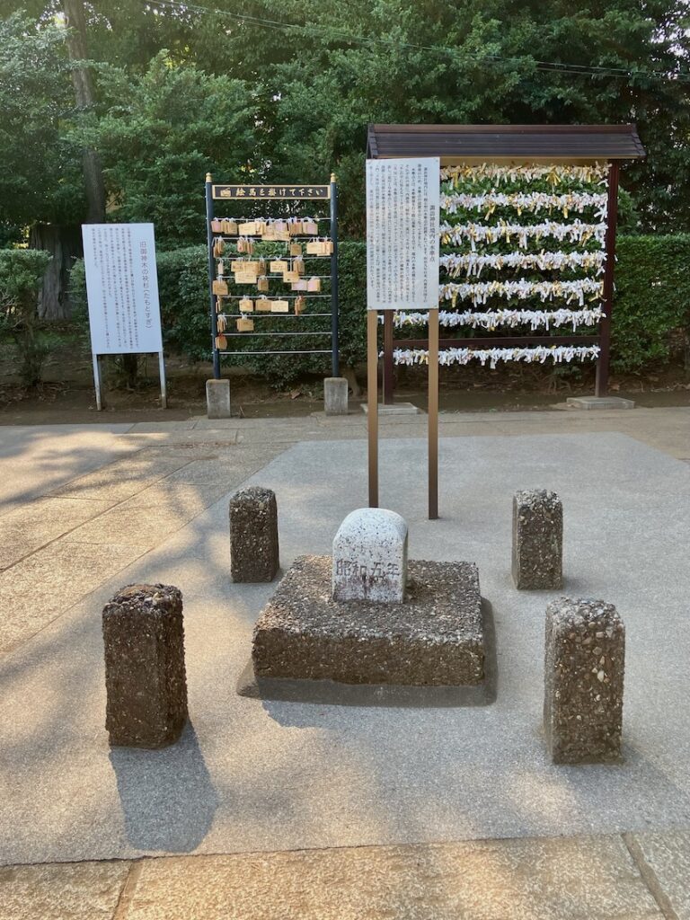 二本のうち一本は早くに枯れ、残る1本は御神木として残りましたが、こちらも傷みが激しく1961年(昭和36年)8月に地上170cmのところで伐採され、その切り株は現在、本殿の裏手に移されています。