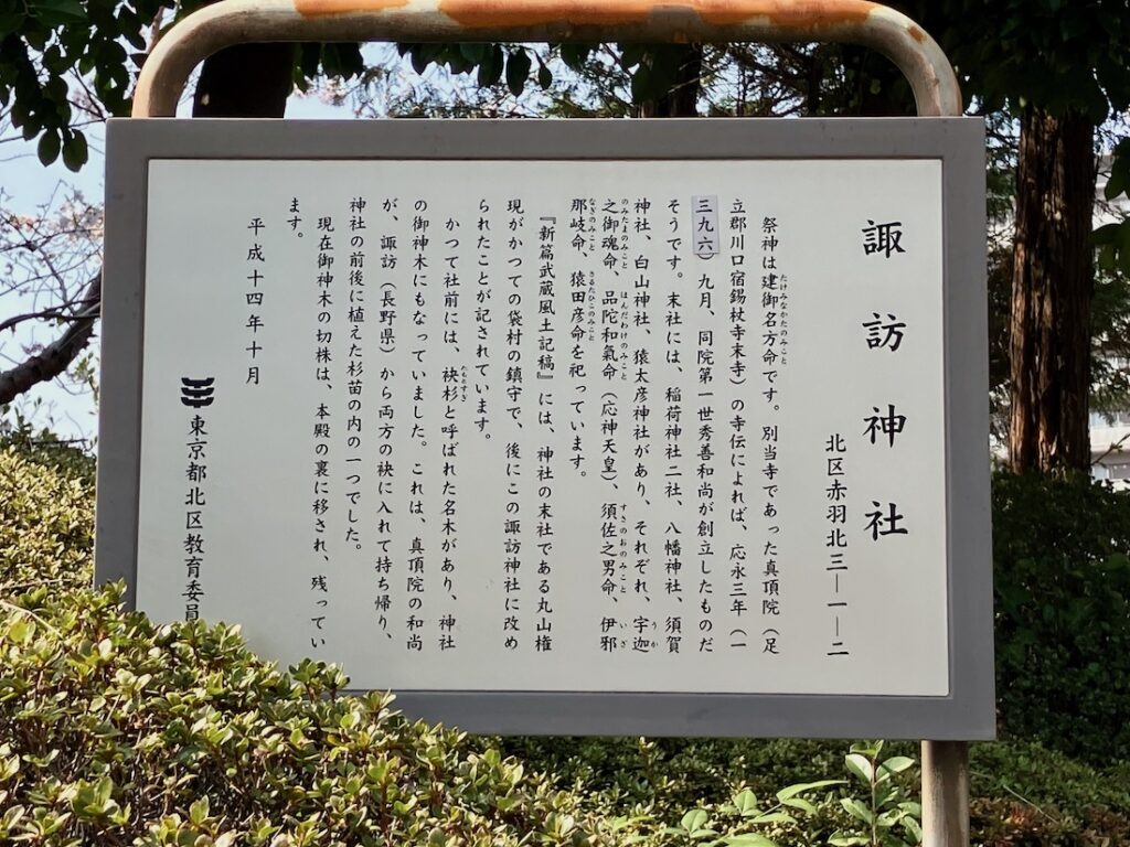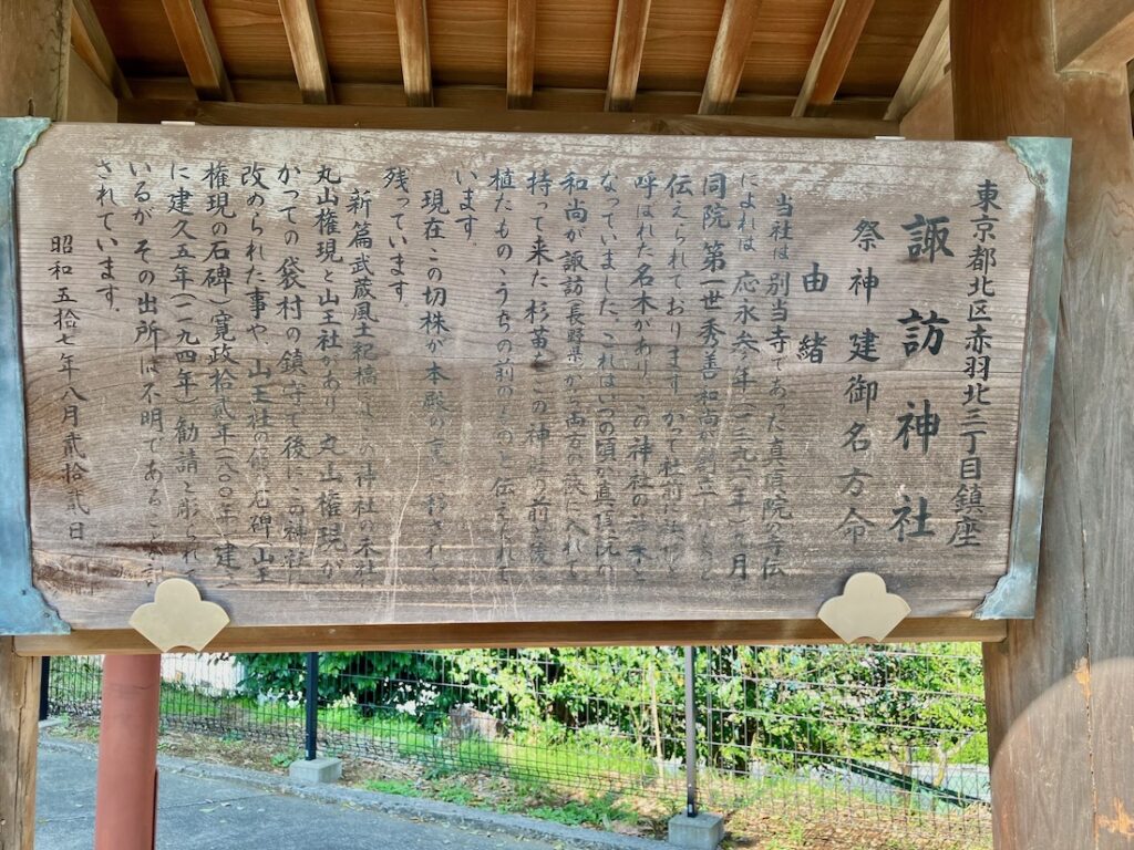「新編武蔵風土記稿」によれば神社の末社、丸山権現がかつての袋村(この神社のある地は江戸時代には袋村と呼ばれていたそう。現在の赤羽北周辺)の鎮守で、後に諏訪神社と改められました。