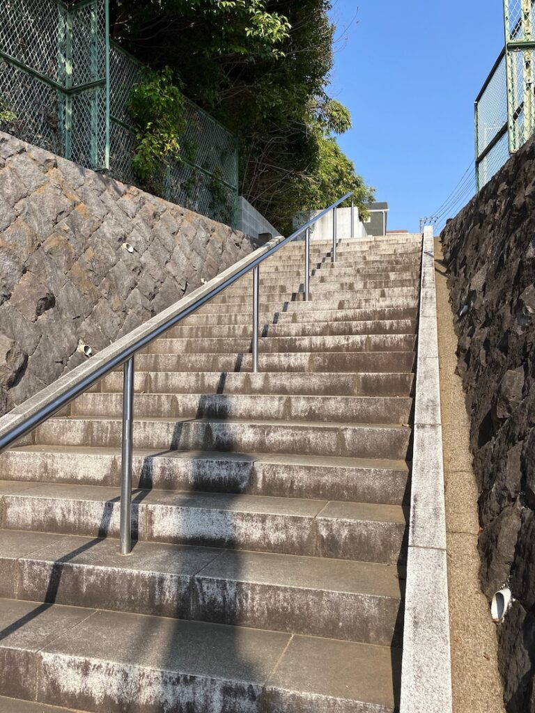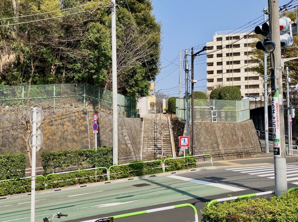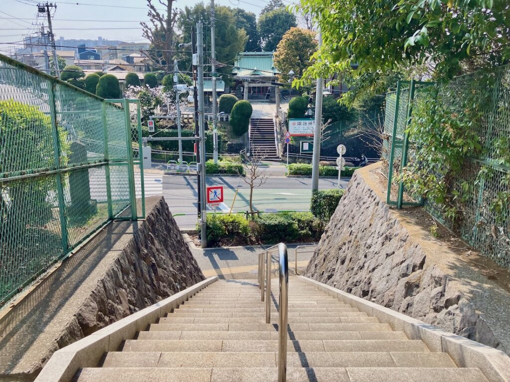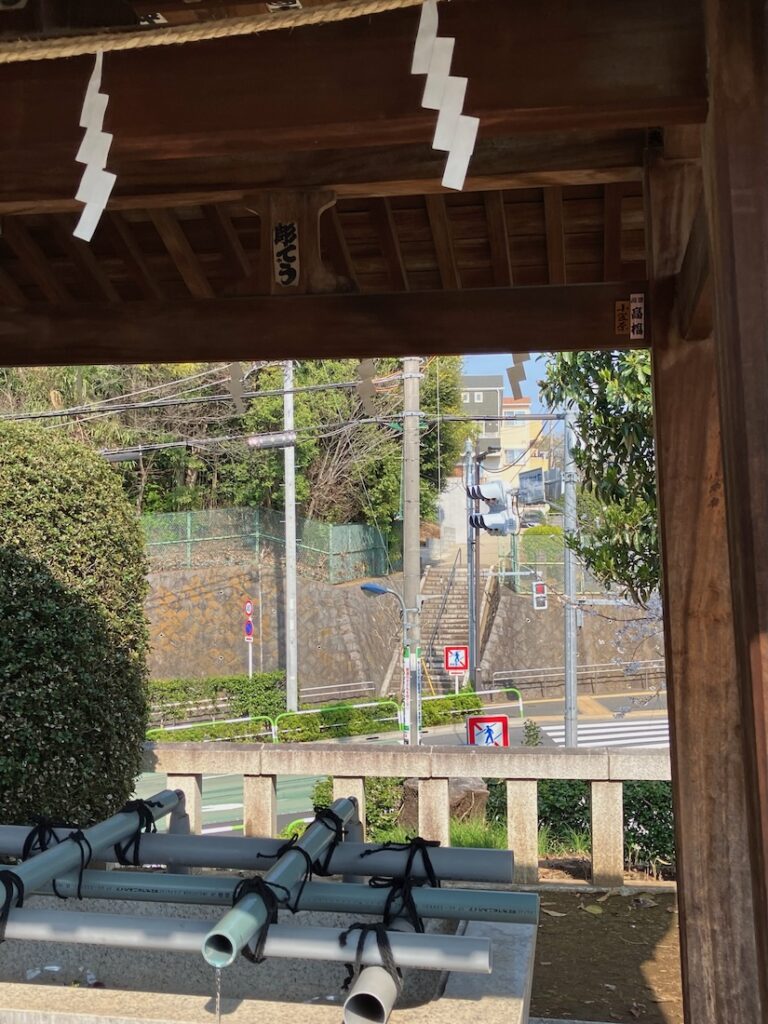 手水舎からの景色。車道の向こうにも石段がありますね。