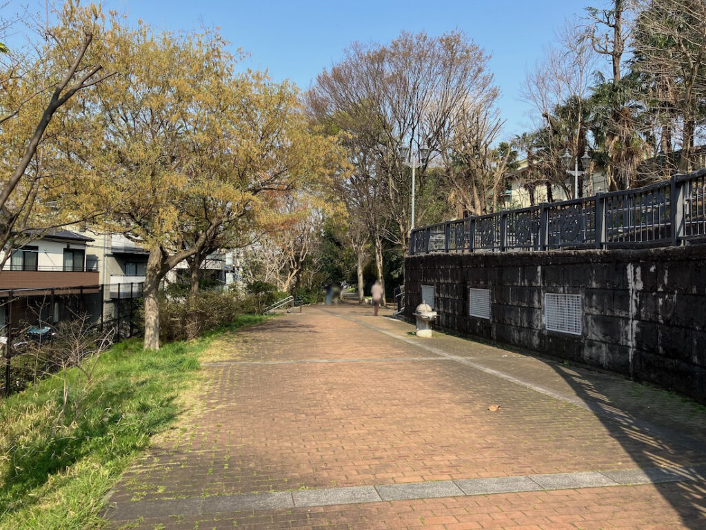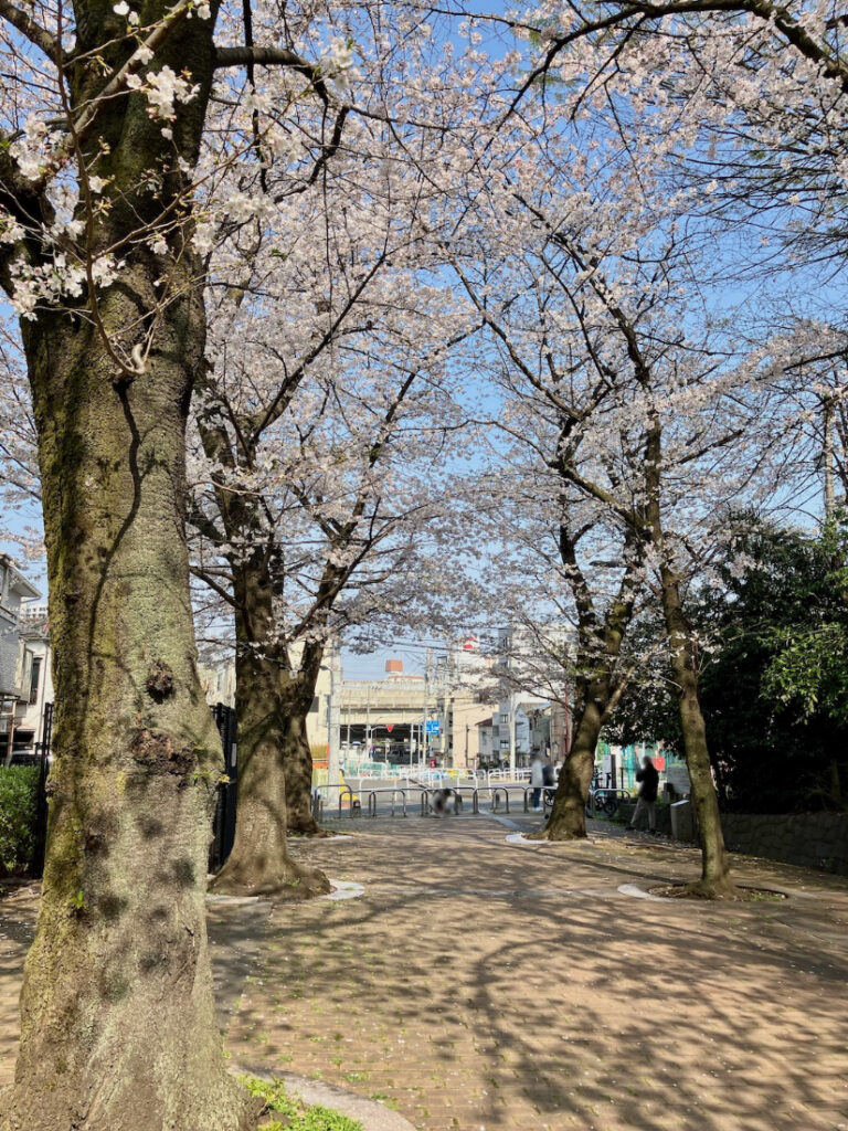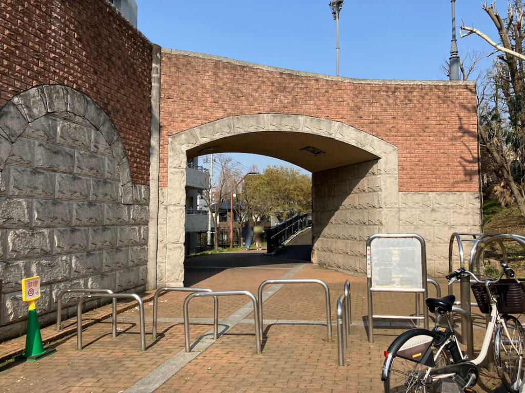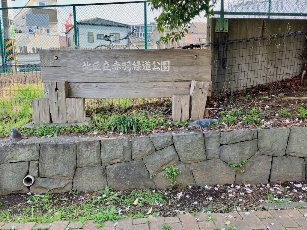 かつて軍用貨物列車の線路が敷設されていた場所に造られた細長い公園「赤羽緑道公園」の並木通りの上に架かる歩道橋ですね。