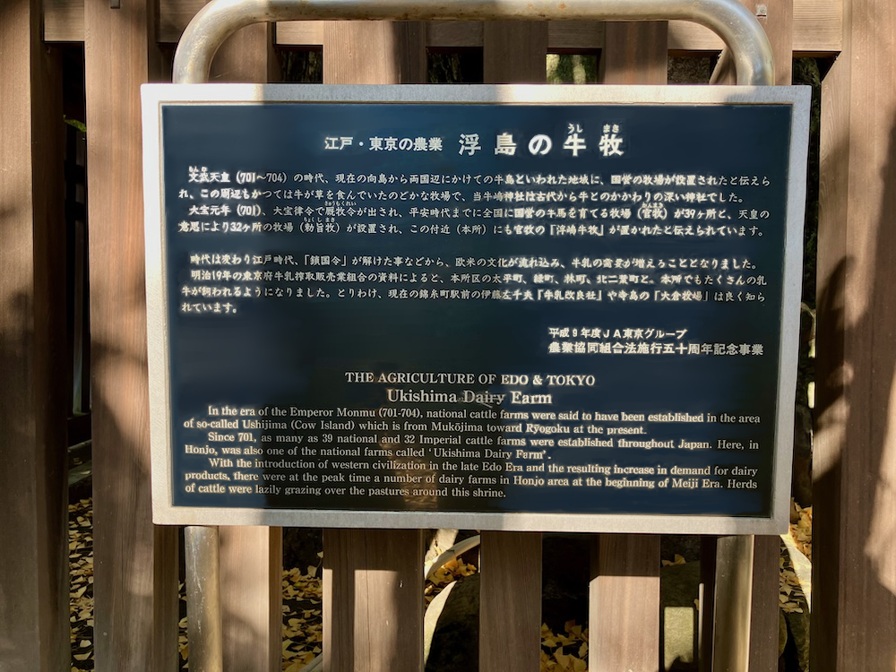 文武天皇の時代(701~704年)、現在の向島から両国辺りにかけて牛島と云われていた地域は、国営牧場が置かれていたと伝えられていて、かつてはこの周辺も牧場だったそうです。